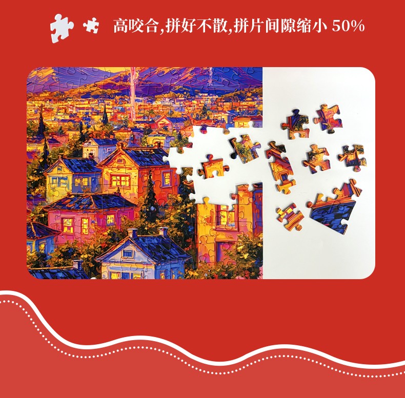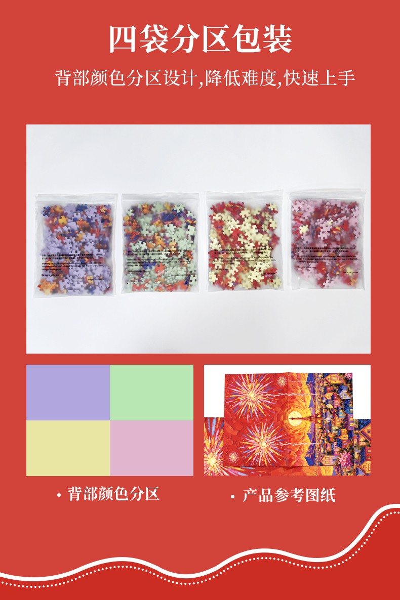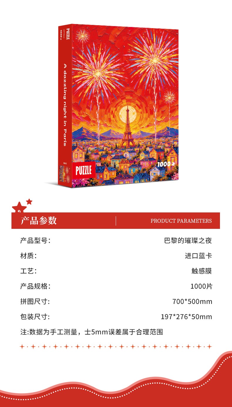 拼圖名稱:進(jìn)口藍(lán)卡-巴黎的璀璨之夜 材質(zhì):紙質(zhì) 拼圖尺寸:700*500mm 拼圖片數(shù):1000片 加工方式:廠規(guī)、來圖定制 包裝尺寸:197*276*50mm
