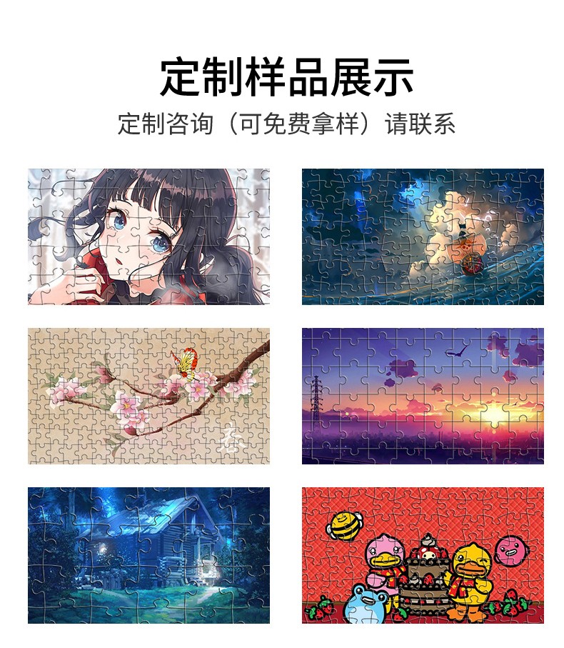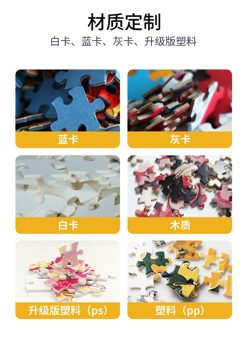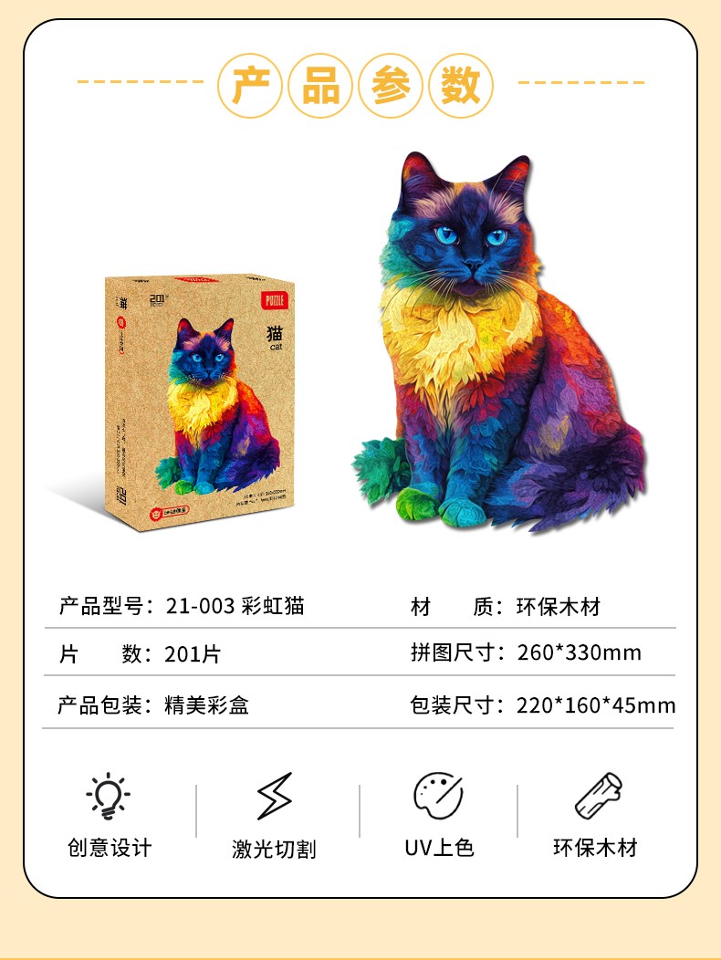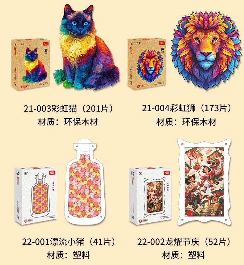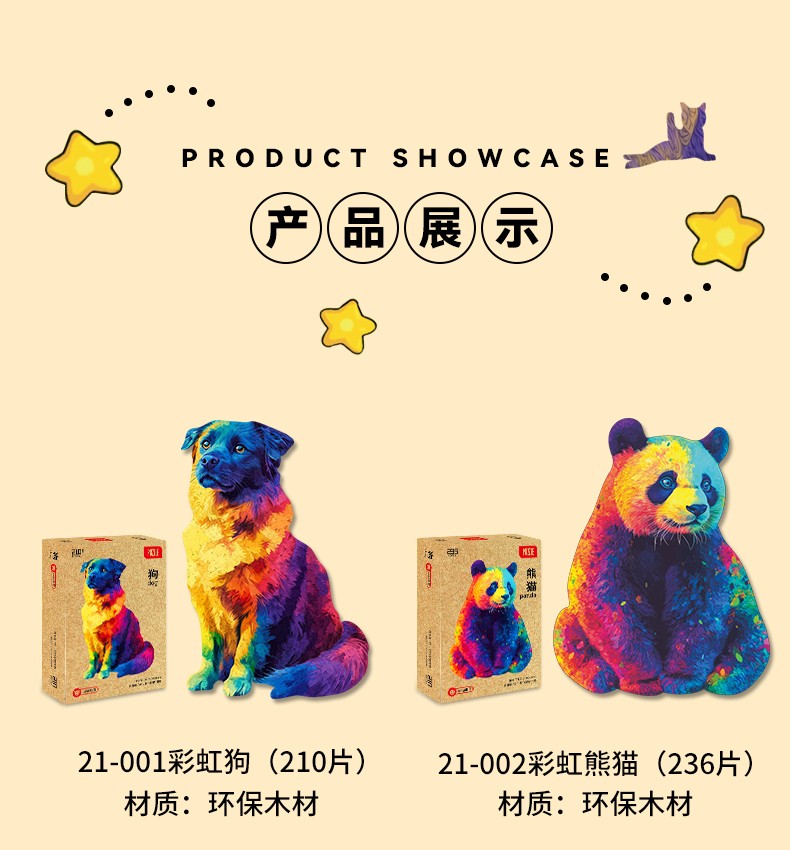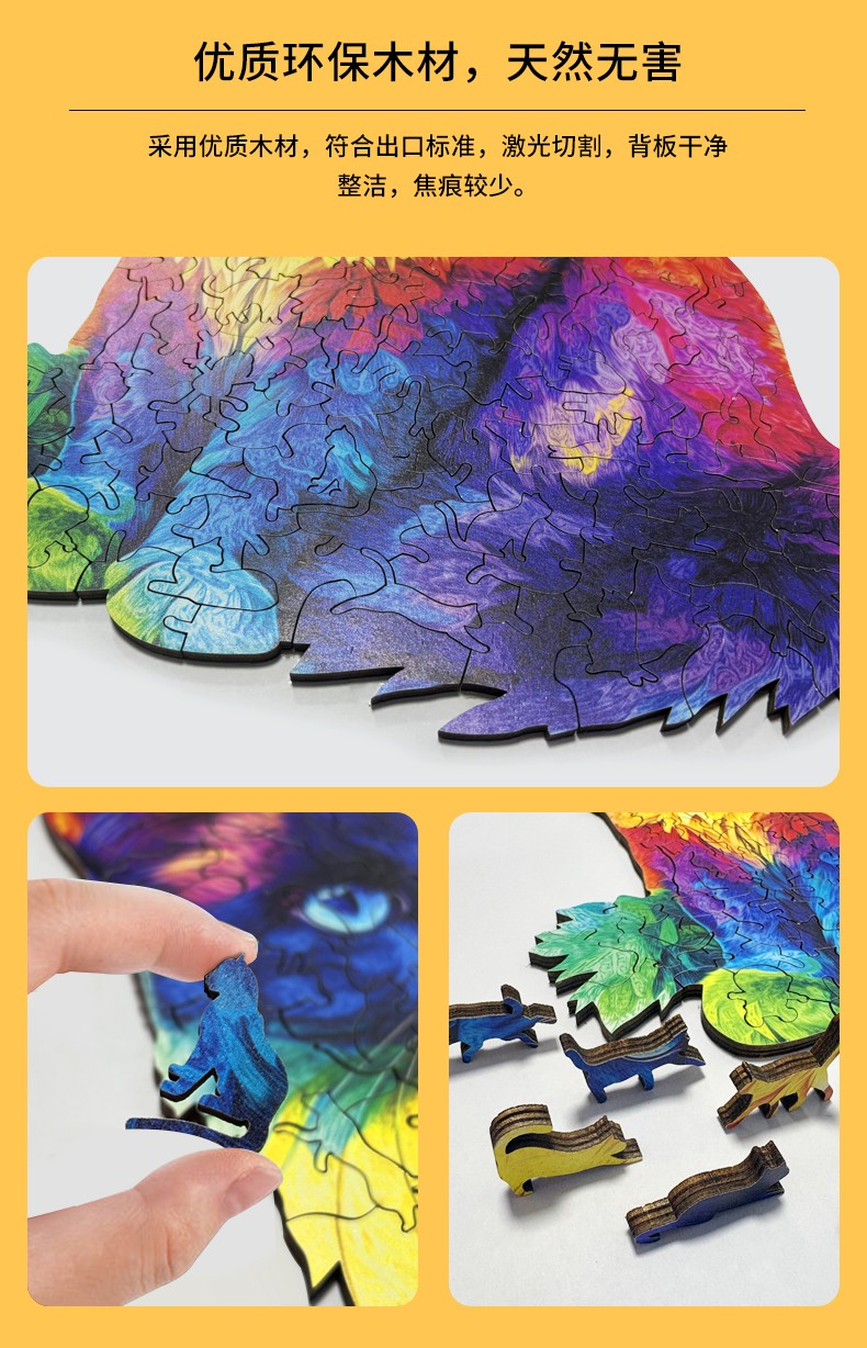 拼圖名稱:木制拼圖異形動物 拼圖尺寸:260*330*4.5MM 拼圖片數(shù):201片 加工方式:廠規(guī)、來圖定制 包裝尺寸:220*160*45mm